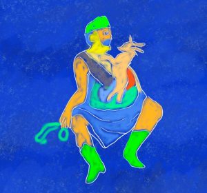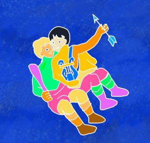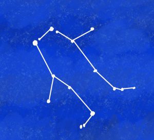 ふたご座:2人の若者が仲良くすわっています。1人は、右手に大きな棍棒をもち、1人は右手にハープ、左手に矢をもっています。その様子から、戦いの勝利をおさめた後のやすらぎのようにも見え、いざとなると戦いに出る用意ができているようにも見えます。聖書に基づく解釈では、この星座は、イエス・キリストと教会との結びつきを示しています。左側の頭にはカストルが輝き、右側の若者の頭にあるポルックスは、「悪の力から解放するために苦難を受ける者」の意味があります。キリストが、苦難を受ける救い主として生まれ、よみがえった主として、教会との結合の座、さばきの座につくことを意味しています。