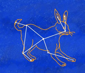 うさぎ座:エジプトやペルシャでは、この星座は蛇の形にも描かれ、オリオンに踏み砕かれる蛇を示しています。伝説からもこのうさぎは、オリオンが狩りの対象としています。オリオンの足の下にあり、踏みにじろうとしている位置にあることでもわかります。この星座は、敵対しているものの運命が尽きる日の近づいていることを示しています。これは、ヨハネの黙示録19章で預言されているように、最後の審判のしるしとして考えられています。