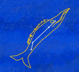 かじき座:もともとはシイラ座とされており、シイラがいつのまにかかじきとよばれるようになったようです。聖書ではヨナの話が有名です。ヨナは神様に背を向け、反対の方向に行こうとしますが、魚に飲み込まれてしまいます。ヨナの切実な祈りを聞かれた神様は、ヨナを魚の中から救い出されるのです。短いヨナ書ですが、旧約聖書にでてきます。かじき座は、近くにきれいなタランチュラ星雲があることでも有名です。