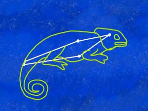 カメレオン座:16世紀以降に作られた星座であり、アフリカ・インド等にカメレオンが生息しているため、船乗りたちが連想したという説があります。体の色が変わることで有名ですが、キリスト教的には、弱かった弟子たちが、復活したイエスに出会い、全くちがったように動き始めたことを連想させられます。