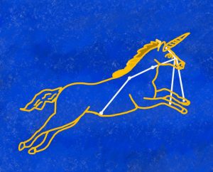 いっかくじゅう座:冬の大三角の中に一角獣のモデルであるユニコーンが横になっている姿がえがかれています。旧約聖書に登場する想像上の動物「ユニコーン」だとされています。ユニコーンは1本の角が生えており、解毒作用があるといわれ、病もなおし、ユニコーンの血を飲めば不応不死になれるなどの伝説がありました。このようなことから、一角獣は幸福をもたらす動物とされ、みんなが一角獣をさがしもとめましたが、見つかることはなかったようです。一角獣を見つけるには心の清らかさが必要とされ、伝説から星座になったと伝えられています。一方で、ユニコーンは、人間の善悪の両方をもつ両義性を伝える存在とも言われています。現在の聖書民数記の23章22節では、「彼らにとって野牛の角のようだ。」と表現されていますが、野牛は,昔一角獣と訳されていたようです。このように一角獣は聖書にたびたび登場しています。したがって、もともとこのいっかくじゆう座は、聖書を元にした星座といえるのではないかと思われます。