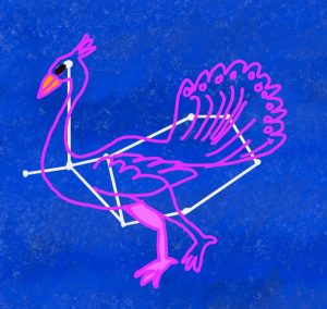 くじゃく座:バイエルが設定した新しい星座です。クジャクは日輪を象徴しています。このことから不死のしるしにもなっています。そこから永遠のいのちを連想させられます。しかし、くじゃくの羽が豪華に見えることから、「傲慢」の象徴とされている部分がありました。ヘビを食べるので悪を滅ぼす鳥とされていたところもあります。