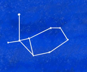 ちょうこくぐ座:フランスの天文学者ラカイユによって考えられた星座です。ハサミのように見えるちょうこくのどうぐをイメージした星座絵になっています。聖書には,人間は神様に似せて作られたという記述がでてきます。ちょうこくぐは、ちょうこくをつくるときの道具ですが、人間がつくられたことを思い出させられるような気がします。