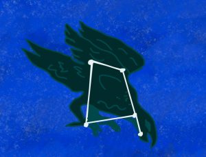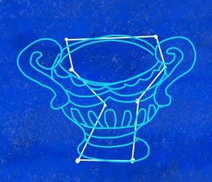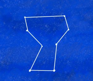 コップ座:コップといっても、私たちが通常使うものとはちがい、ギリシャの工芸品に見られる、両側に耳のような取ってのついた立派な盃でクラーテルという酒と水を混ぜる器のことです。しかし、ヨハネの黙示録(第14章)では「神の激しい怒りのぶどう酒を飲み、」と表され、混ぜものなしのぶどう酒がでてきますが、これは神の激しい怒りとさばきを意味しています。終末には、悪魔や不信者の上に、神の怒りのぶどう酒はやむことなく注がれるとされています。