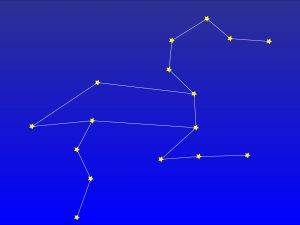 ろくぶんぎ座:ポーランドのヘベリウスによってつくられた星座です。六分儀とは測量につかわれる道具です。星座にされた理由は天体観測の時に望遠鏡を使わずに、肉眼で六分儀を使用していたからだとされています。キリスト教では、聖書が六分儀のように大事な方向を示す役割をしているように思います。イエスキリストの父なる神を指し示しているように感じるのです。