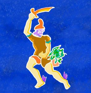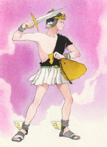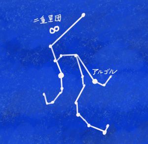 ペルセウス座:旧約聖書ミカ書2章13節に次の言葉があります。「打ち破る者が、彼らに先立って上ると他の者も打ち破って、門を通り、外に出る。彼らの王が彼らに先立って進み主がその先頭に立たれる。」この打ち破る者がここに描かれた勇者ペルセウスの名です。頭にヘルメット、足には翼をもち、右手に武器をかかげ、左手にメドウサの頭をもっています。この星座の名は、勇者の足先にあるアティクス(打ち破るものの意味)からきたといわれています。β星アルゴルは「悪霊」を意味しており、くじら座のミラと同じく変光星です。キリストは永遠に変わることのない権威によって悪魔を支配し、来るべき終わりの日には、ついに悪魔を永遠の滅亡へと追いやってしまうのです。救い主キリストは、レビヤタン(水中の怪物・くじら座)を打ち砕き、メドウサの頭からアンドロメダを引き離し、教会をカシオペヤの王座につけたのです。二重星団はとてもきれいな2つの散開星団です。