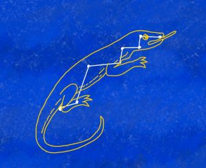 とかげ座:17世紀ポーランドの天文学者ヘベリウスによって設定されました。小さく輝く星たちを見て「とかげのうろこ」を連想したようです。また、キリストトカゲとよばれるトカゲがいます。危険を感じると水面の上を走ることができるそうです。聖書では、イエス・キリストが湖の上を歩いて弟子たちの舟までこられたとあります。あれている海であってもイエスがいっしょに乗られると,舟が目指す地についたのです。(ヨハネによる福音書6章16~21節)