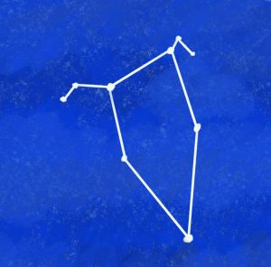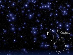ケフェウス座:左手に王位の印であるしゃくを持ち、右手には春夏秋冬を表すリボンを持ち、星をちりばめた王冠をいただいています。ここに、復活し、昇天したキリストの栄光に輝く姿を見ることができます。王の右肩に輝く星はアルデラミンと呼ばれ「急ぎ帰る」を意味し、腰の周りのアルフィルクには、「あがない主」左膝のエライには、「羊飼い」の意味があります。イエス・キリストは、私たちの罪のあがないとして、十字架上で死の苦難を受けましたが、神は高く天に上げ、右の座にすえ、すべてのものの支配と力との上に立たしめたのです。